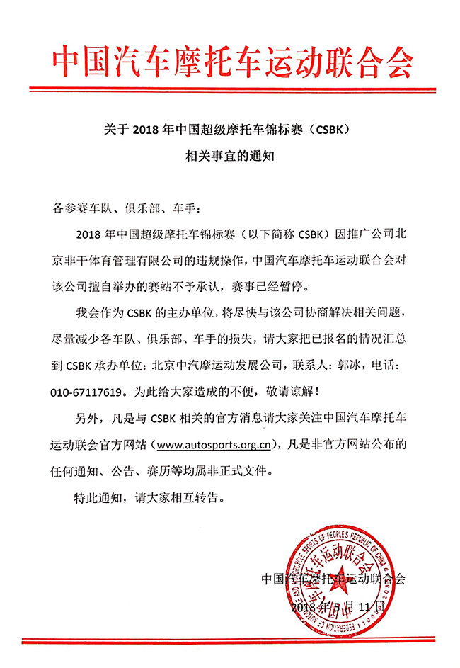 关于2018年中国超级摩托车锦标赛(CSBK)相关事宜的通知